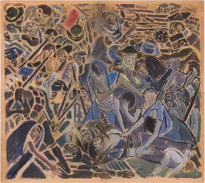 ویفردو لام. La Guerra Civil (جنگ داخلی اسپانیا). ۱۹۳۷. گواش بر روی کاغذ نصب شده بر بوم