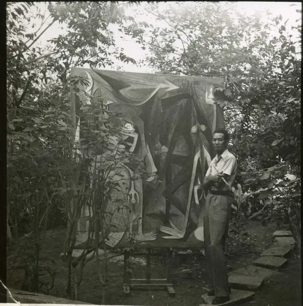 ویفردو لام به همراه اثر ناتمام Bélial, empereur des mouches (بلیال، امپراتور مگسها) (۱۹۴۸) در باغ خود در هاوانا، ۱۹۴۷