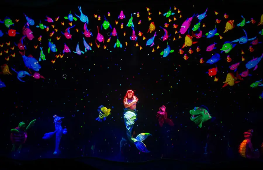 بیشتر نگران دیدن اولین اجرای «پری دریایی کوچولو: یک ماجراجویی موزیکال» (The Little Mermaid: A Musical Adventure) بودم. این نمایش صحنهای که به تازگی بازطراحی شده و در تابستان افتتاح شده است، هنوز هم محبوب است و نمایشهای بعدی در روز خیلی زودتر پر میشوند.