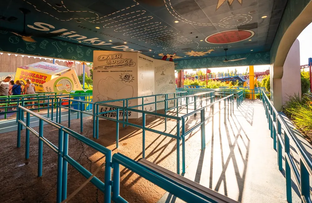 وقتی وارد «سرزمین اسباببازیها» شدم، «اسلینکی داگ دش» уже در حال کار بود که به خودی خود نشانه امیدوارکنندهای بود. من نزدیک به جلوی جمعیت بودم و پس از حدود ۵ دقیقه توقف روی پل منتهی به «اسلینکی داگ دش»، صف در ساعت ۸:۱۲ صبح باز شد.