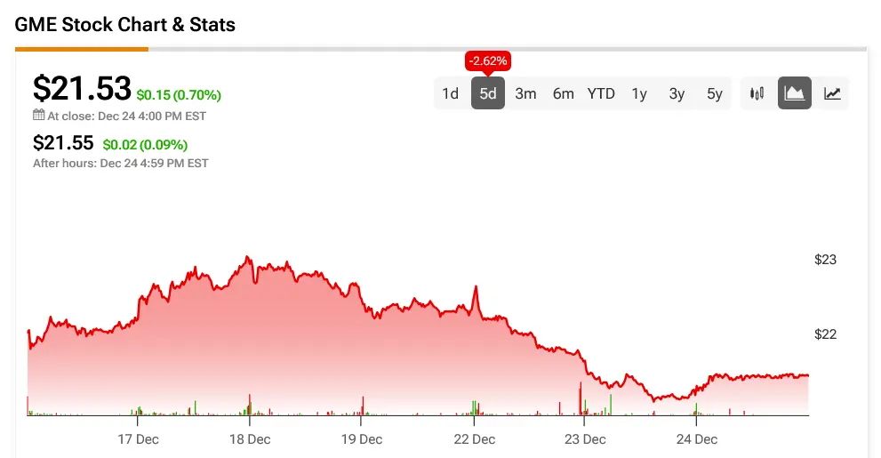 نگاهی به وال استریت میاندازیم؛ در حال حاضر هیچ تحلیلگری موقعیتی در مورد سهام GME ندارد. پس از کاهش ۳۴٫۷۴٪ در قیمت سهام طی سال گذشته، بررسی پنج روز اخیر معاملات GME نشاندهنده نوسانات قابلملاحظهای است. بهبود جزئی در اوایل این دوره دوباره از دست رفت و در نهایت، حرکات قیمت بهصورت افقی باقی مانده است.