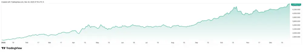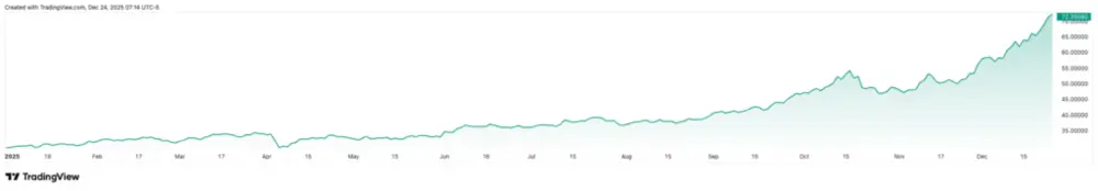 در زمان نگارش این مطلب، بیت‌کوین حدود ۸۷٬۱۸۲ دلار معامله می‌شد که نسبت به ابتدای سال حدود ۵٪ کاهش داشته است؛ اتر نزدیک ۲٬۹۲۸٫۳۴ دلار بود که حدود ۱۲٪ کاهش یافت؛ طلا در حدود ۲٬۹۲۸٫۳۴ دلار معامله می‌شد که حدود ۷۱٪ افزایش داشت؛ و نقره نزدیک ۷۲ دلار بوده که حدود ۱۴۸٪ رشد داشته است.
